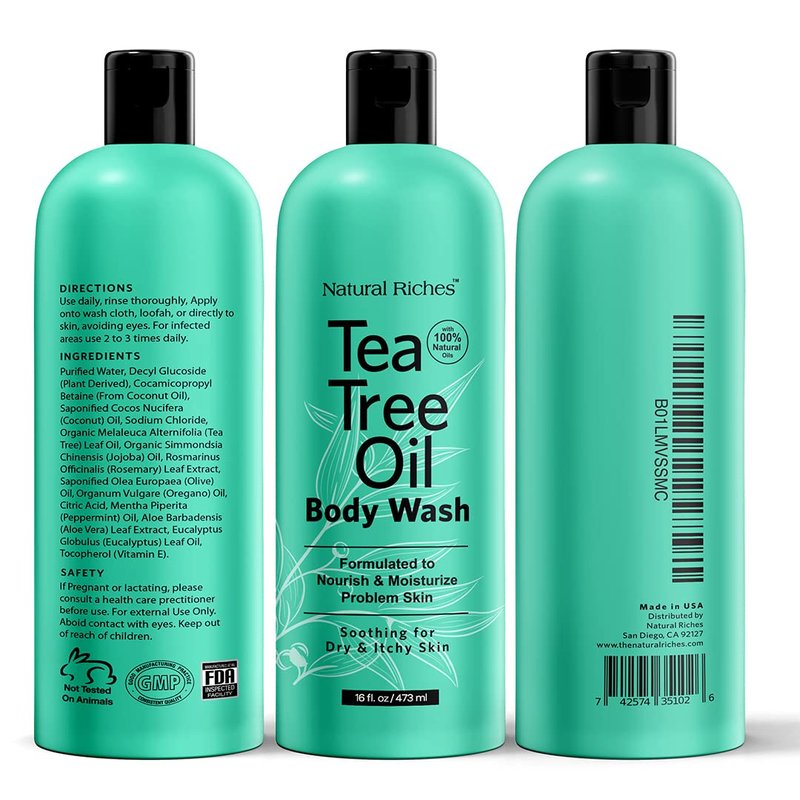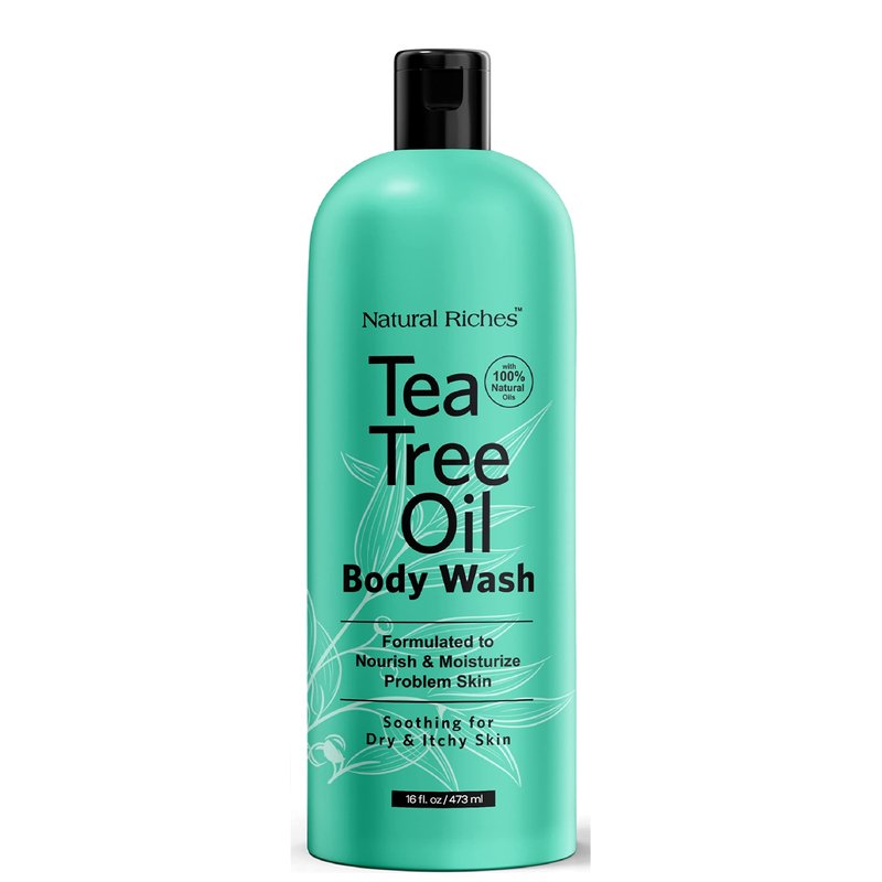 Introducing Natural Riches Tea Tree Body Wash, the ultimate solution for your skin's needs. Our premium formula is enriched with the finest ingredients, including tea tree oil, to provide you with a refreshing and invigorating bathing experience. Harnessing the power of nature, our Tea Tree Body Wash is designed to soothe skin irritations, combat body odor, and promote overall skin health. With a blend of tea tree, jojoba, coconut, rosemary, olive, oregano, peppermint, aloe, and eucalyptus oils, our body wash delivers a multitude of benefits for your skin. Say goodbye to athlete's foot, acne, cuts, ringworms, and other skin conditions with our clean body wash. Its potent properties help alleviate discomfort and irritation, leaving your skin feeling clean, refreshed, and revitalized. Our Tea Tree Body Wash is perfect for active teens, athletes, manual laborers, and anyone suffering from existing skin irritations. It cleanses, hydrates, and nourishes your hair, skin, and nails, ensuring you stay at the top of your game every day. Trust in the quality packaging of our BPA-free plastic bottle, designed with your health and well-being in mind. Embrace the confidence of using a safe, reliable product that delivers results you can trust. Experience freedom from itchiness with our invigorating blend of essential oils. Our Tea Tree Body Wash calms itching, banishes dryness, and eliminates unpleasant odors, giving you the confidence to embrace every moment. Indulge in the ultimate skin nourishment with our Tea Tree Body Wash. Immerse your skin in luxury with our vitamin-rich formula, leaving your skin feeling refreshed, rejuvenated, and irresistibly smooth/ Elevate your bathing routine with Natural Riches Tea Tree Body Wash. With its powerful blend of ingredients and refreshing scent, it's the perfect addition to your daily skincare regimen. Try it today and experience the difference!