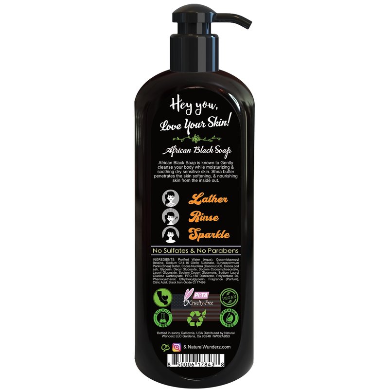 Natural Wunderz Body Wash with African Black Soap and Shea Butter, 32 Fl Oz Shower Gel, Promotes Acne Treatment, Contains All Natural Extracts, Vegan, and Sulfate-Free Body Scrub