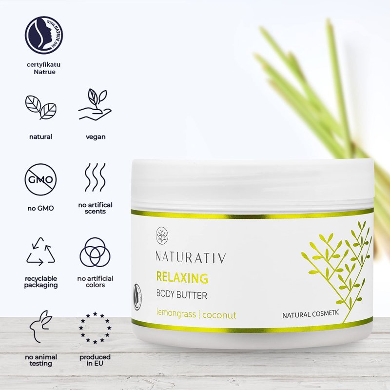 - Pamper your skin and calm your mind with Naturativ Relaxing Body Butter for the ultimate after-shower experience in skin hydration. How to Use: Use generously day and night to moisturize and nourish your skin and to energize your mind.