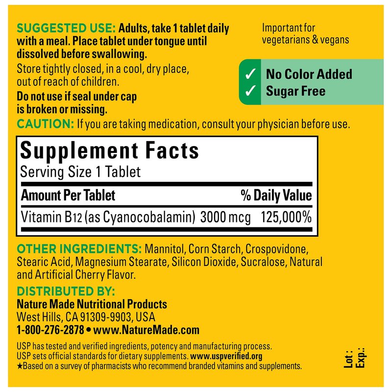 - Easy to take with a great tasting flavor; simply dissolve 1 tablet under tongue before swallowing. Adults take one Vitamin B12 tablet daily with a meal