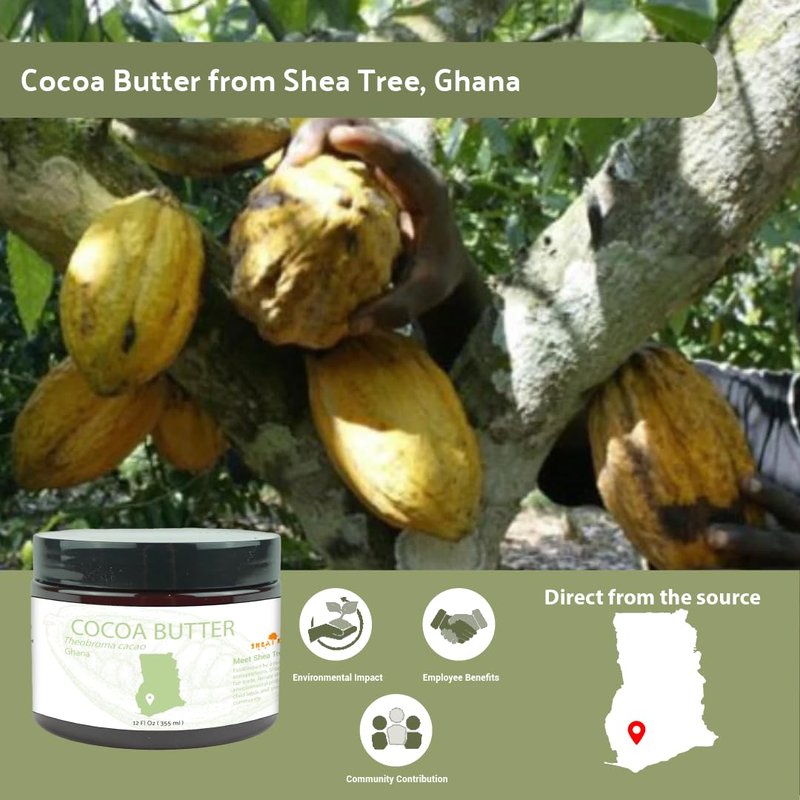 - Direct From Ghana: Shea Tree Ghana's organic cocoa butter is sourced directly from Ghana's savannah regions. The region boasts an abundance of cacao plants, making it an ideal source.