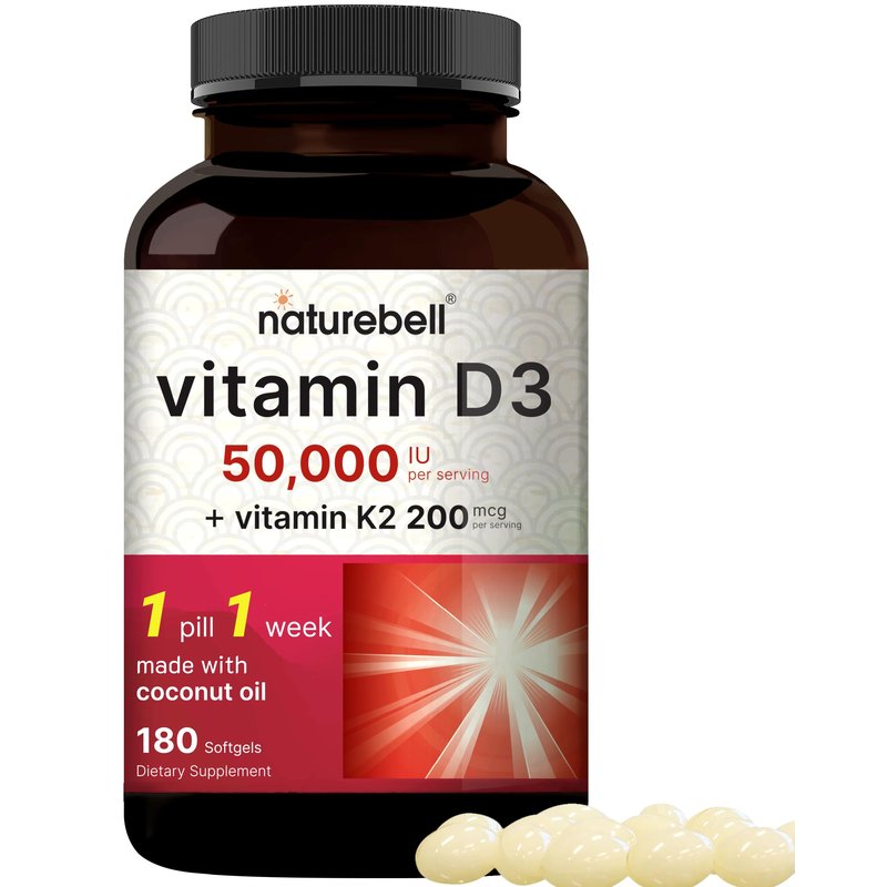 NatureBell Vitamin D3 50,000 IU + K2 200 mcg, 180 Softgels | Once-Weekly Formula with Coconut Oil | Max Strength Bone, Heart & Immune Support | MK-7 Form | Non-GMO