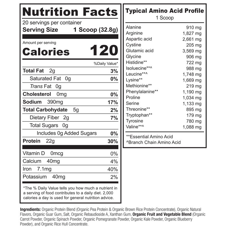 - COMPLETE VEGAN PROTEIN: Easily meet your protein needs with 22 g high quality plant protein from organic pea and organic brown rice in just one scoop. Includes all 9 essential amino acids to help you power through your day or your workout.
