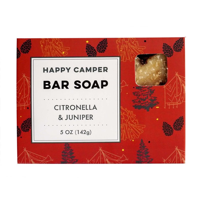 Our premium Happy Camper Bar Soap is great for camping, hiking, kitchens, and grease monkeys! It contains 5 essential oils that together create an aroma to naturally deter bugs and ground Juniper Berries give it a light woodsy, piney scent. Ground Juniper Berries and Dead Sea salts gently exfoliate dirt and grime away.