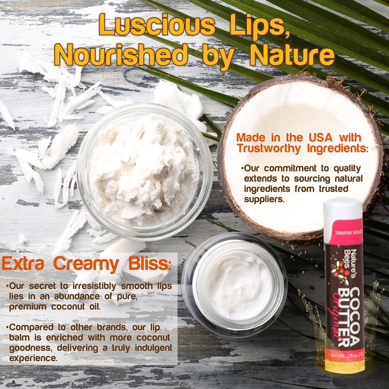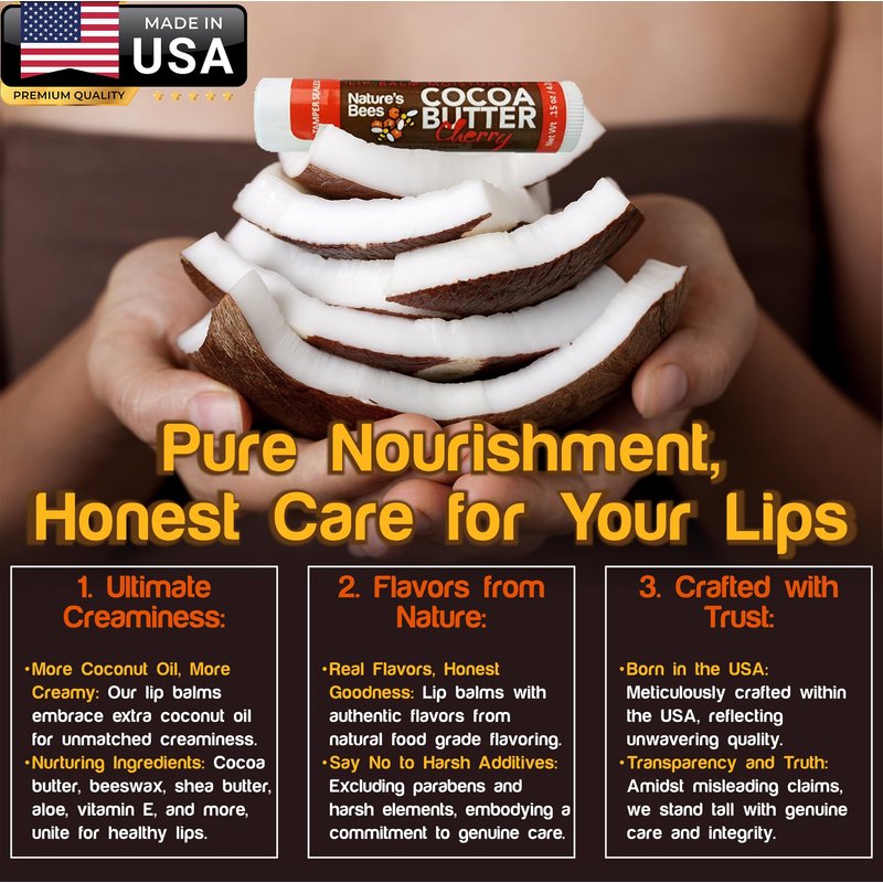 - SOOTHING CARE FOR LIPS YEAR ROUND - Keep a Nature's Bees Cocoa Butter Lip Balm handy in your purse, desk, car, backpack, nightstand, or pocket year-round. From red, chapped winter lips to dehydrated summer lips, our lip balms are ideal for keeping lips soft and supple all year long.