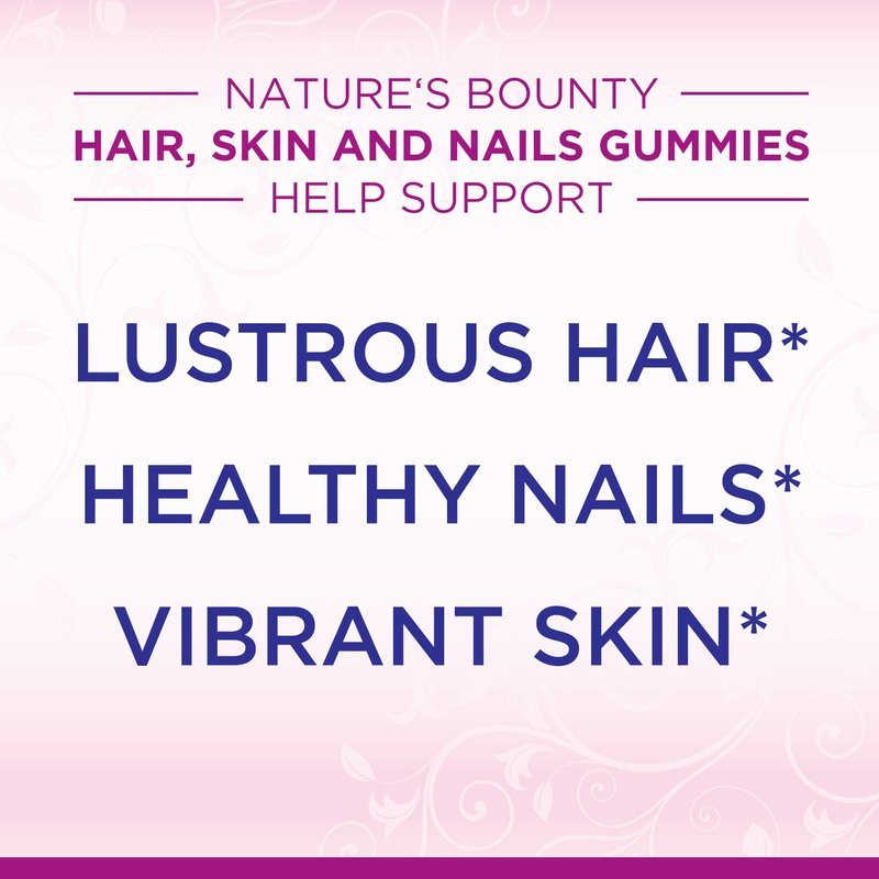 - WITH BEAUTY-SUPPORTING BIOTIN: Nature's Bounty Hair, Skin & Nails Gummies contain beauty-supporting biotin, a vital nutrient that helps to maintain healthy hair while supporting overall beauty.*