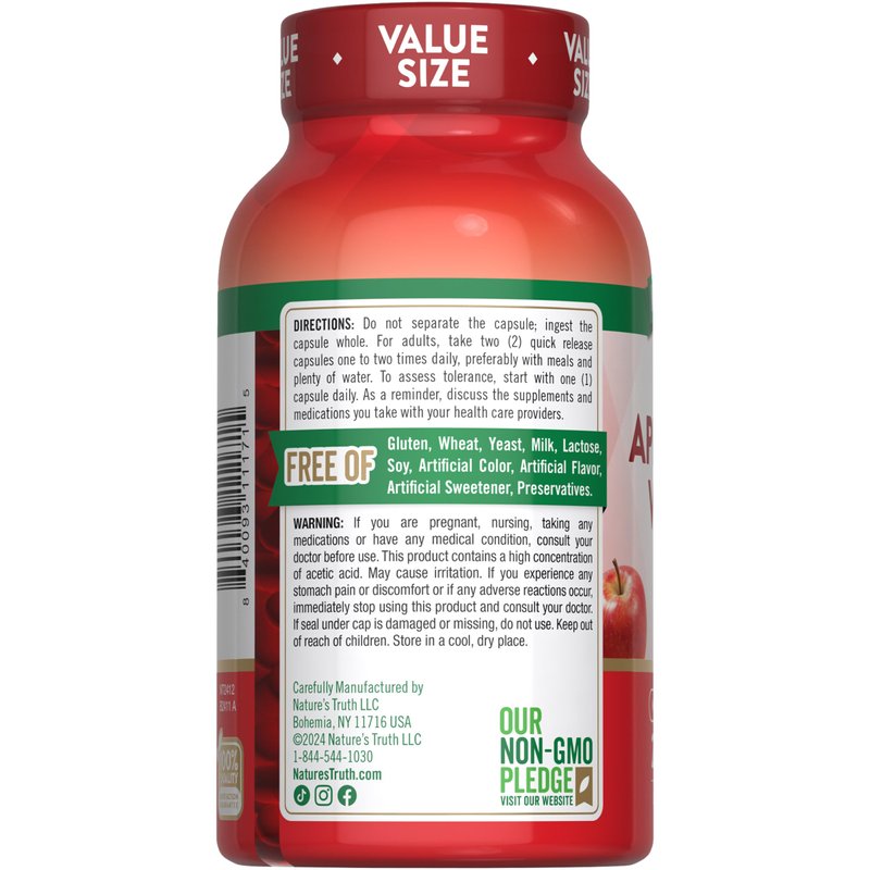 Our mission at Nature’s Truth is to meet your wellness needs with products that go above and beyond. Nature’s Truth provides supplements in various delivery forms, such as capsules, softgels, chewables, tablets, powders, liquids, and gummies to suit every preference. Our Apple Cider Vinegar non-GMO and free of gluten, wheat, yeast, milk, lactose, soy, artificial color, artificial flavor, artificial sweetener, and preservatives.
