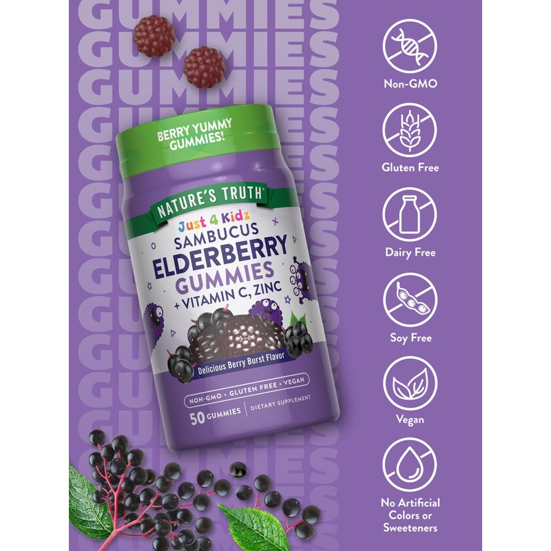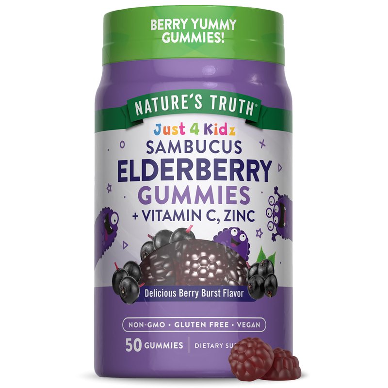 Give your little ones the support they need with great tasting berry-flavored elderberry gummies they'll love! Nature's Truth Just 4 Kidz Elderberry Gummies are a delicious way for kids to get the important support of an Elderberry supplement, plus essential Vitamin C and Zinc. Sambucus Elderberry extract is naturally rich in antioxidants and flavonoids, and our elderberries are carefully harvested to preserve their quality. These vegan gummies are berry flavored and easy for kids to take. Just one berry burst flavored gummy a day provides the equivalent of 200 mg of Sambucus Elderberry, 50 mg of Vitamin C, and 3.75 mg of Zinc. Why choose capsules, tablets or powders when you can enjoy these delicious berry flavored gummies daily? At Nature's Truth, we know how important a clean wellness experience is for you and the ones you love. We use only the very best ingredients to create our Elderberry Gummies for kids. They are vegan friendly, Non-GMO, gluten free, wheat free, yeast free, milk free, lactose free, and soy free. They were created without any artificial colors, and artificial sweeteners, so you and your family can get the pure and honest nutrition you've come to expect from Nature's Truth.