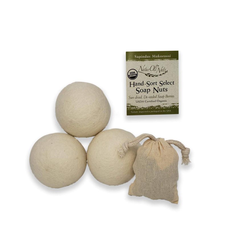 SPECIAL BUNDLE! Includes Bonus NaturOli Organic Large Soap Nuts Sampler! Our JUMBO Wool Dryer Balls are a fabulous environmentally friendly, all-natural laundry aid. The quintessential combo when used with soap nuts! Enjoy a totally natural laundry room! Will not get tangled in clothes like "tennis ball" size balls being sold by most. (Note that few brands provide specifications) Our JUMBO-sized Wool Dryer Balls shorten drying time (saving energy) while softening and fluffing laundry to help reduce static. Many users reduce dryer temperature - saving energy while being gentler on fabrics. HAND FELTED! No synthetic materials or chemicals are used. They will not unravel with normal use. Will last for years! **TIP: Do not over-stuff loads. Overstuffed loads will not clean nor dry as well. Do not over-dry. If a light scent is desired, a few drops of your favorite essential oil (EO) may be applied directly to the dryer balls or an absorbent cloth. We do NOT recommend use of EO's in wash water. It is normal for our large dryer balls to become out of round. This does not impair their function. You can moisten and reshape them a bit, but it is not necessary.
