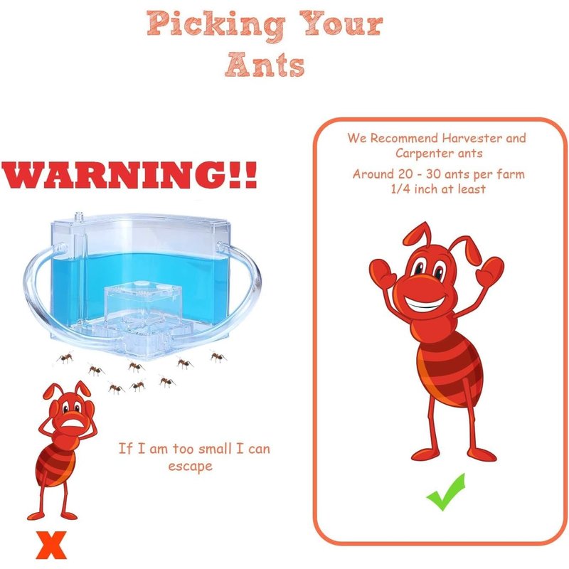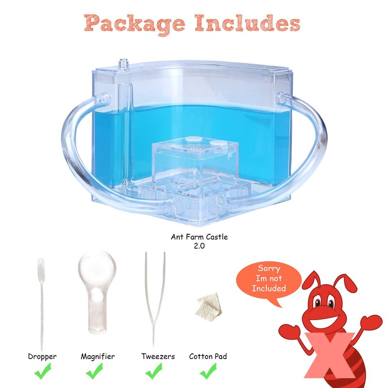 - 🏰LIVE ANTS ARE NOT INCLUDED, YOU WILL GET: 1x Ant farm castle 2.0 with blue gel ; 2x connecting tubs; 1x magnifier; 1x pipette; 1x nipper, 2x cotton pads, 1x manual booklet. ATTENTION !! LIVE ANTS ARE NOT INCLUDED!! Please buy ants from trusted sources, we suggest 20-30 harvester ants or carpenter ants that are over ¼ long.