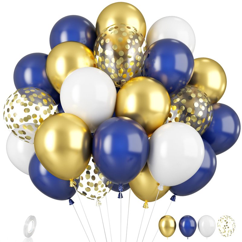 - Package Include: Our 35PCS navy blue and gold balloons is the ideal way to add a touch of elegance to your event! It mix of navy blue gold and white balloons, including 10 x 10inch white balloons, 15 x 10inch navy blue balloons, 5 x 10inch metallic gold balloons, 5 x 12inch gold confetti balloons, and a white ribbon.