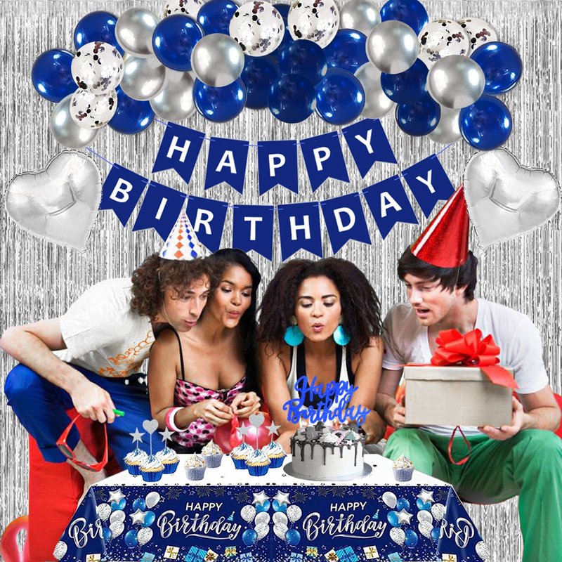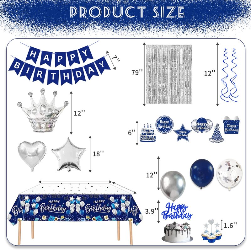 - [All In One Package]: Our navy blue and silver birthday decorations for men kit includes 1 x happy birthday banner, 2 x silver fringe curtains (1M*2M), 1 x silver crown balloon, 12 x hanging swirls(6*silver+6*blue+6*cards), 2 x love heart aluminum balloons(18in), 2 x five-pointed star aluminum foil balloons(18in), 10 x navy blue Balloons(12in), 10 x silver metallic balloons(12in), 12 x silver confetti balloons(12in), 7 x cake topper set, 1 x navy blue tablecloth.