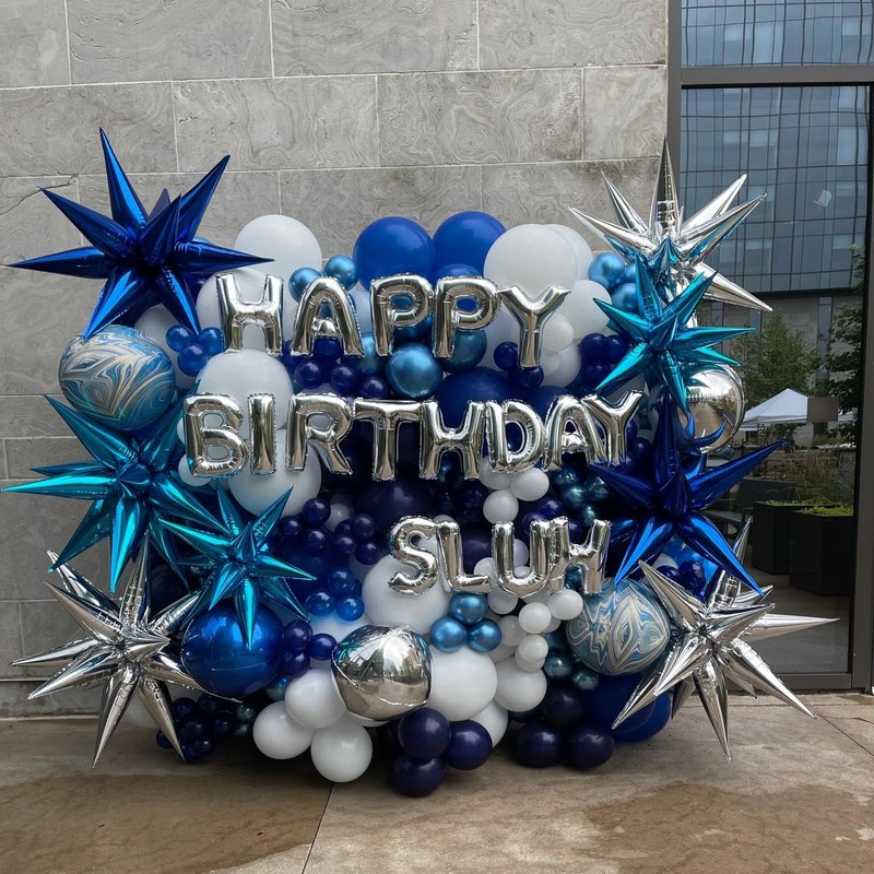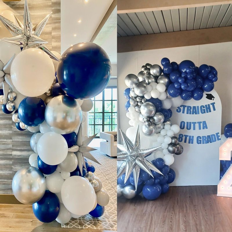 - Balloons: The kit includes high-quality blue and white balloons made from durable latex material. These balloons are designed to be vibrant and long-lasting, ensuring a visually appealing and reliable display. Additionally, the kit features silver foil stars that add a touch of sparkle and glamour to your decor.
