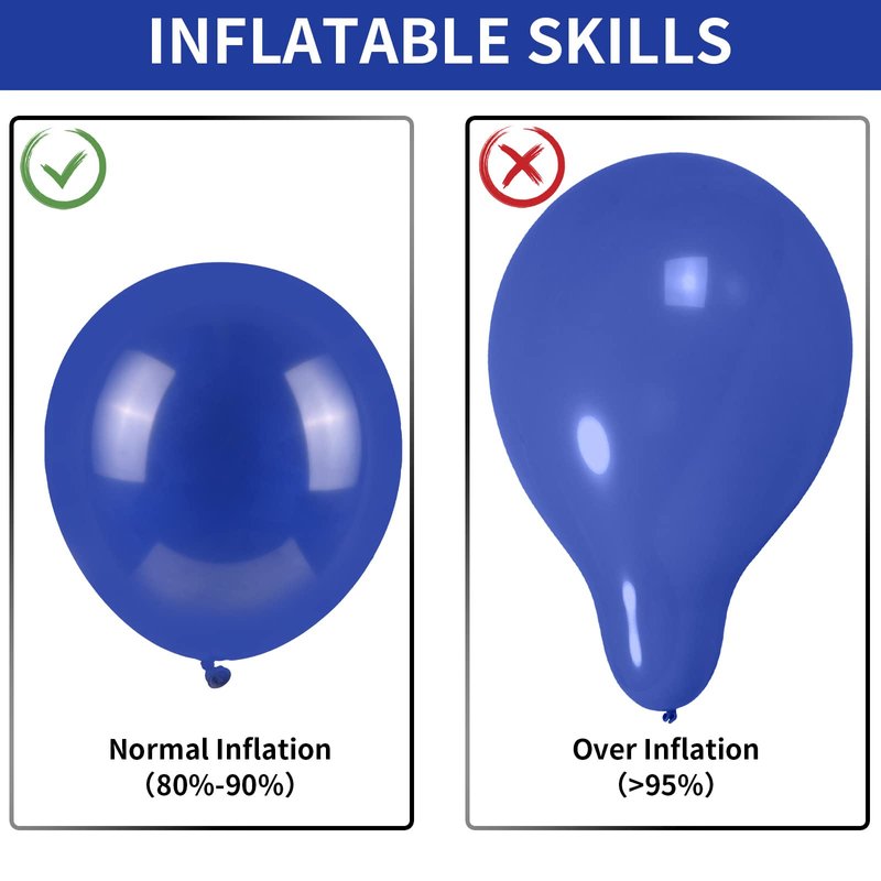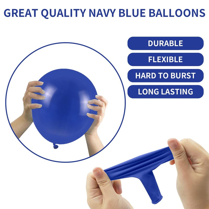 - 5”+10''+12”+18'' PARTY BALLOONS: Navy blue balloon garland kit includes 100pcs dark blue balloons: 40pcs 5 inch navy blue latex balloons, 35pcs 10inch matte navy blue balloons, 20pcs 12 inch navy blue balloons, 5pcs 18inch matte navy blue balloons, 1 roll of balloons strip tape, 1 roll of balloons glue, 1 white ribbon