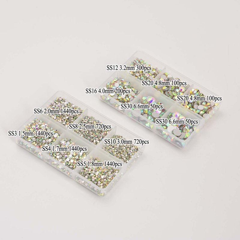 - Sizes & Quantities - 8000 Pieces Varies Sizes Tiny Rhinestones in 2 boxes, 10 sizes: (BOX 1: ss3 1440pcs for one Grid, ss4 1440pcs for one Grid, ss5 1440pcs for one Grid, ss6 1440pcs for one Grid, ss8 720pcs for one Grid, ss10 720pcs for one Grid.︱BOX 2: ss12 300pcs for one Grid, ss16 200pcss for one Grid, ss20 200pcs in total in two Grids,ss30 100pcs in total in two Grids) Enough Quantity To Decorate Various Items, Adds Sparkle And Glamour To Your Things