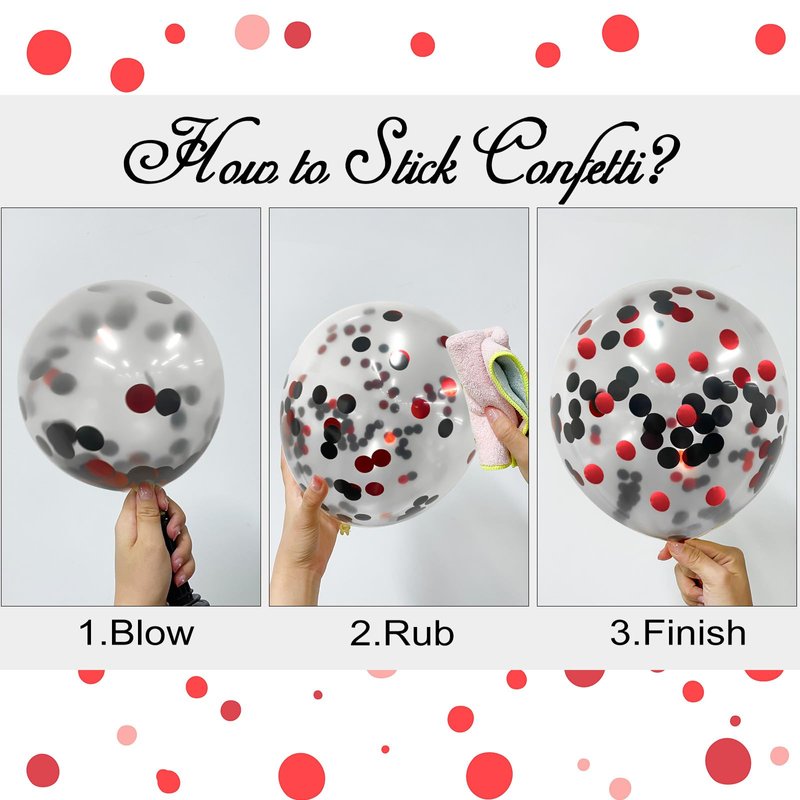 - How to use: Balloons support both air and helium, after blowing up the confetti balloons, rubbing the balloon on hair or fabric wool and shaking it will help stick the side, which can make it look more beautiful