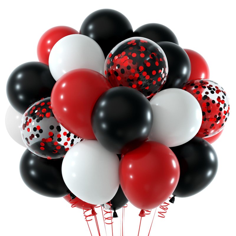 - Red black and white confetti balloons set: This balloon kit includes 18 red balloons, 18 black balloons, 18 white balloons, 6 confetti balloons, and match 2 rolls of ribbons red and black
