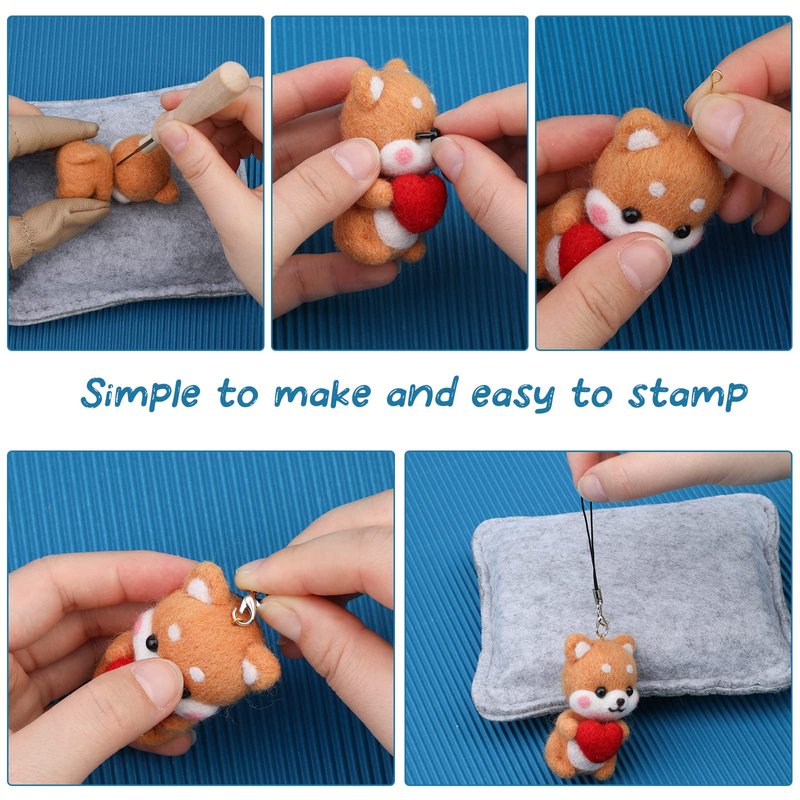 - 🐑 The seven wool felt molds allow you felting cute crafts in different shapes. The oil wiping cloth allows you to wipe the protective oil on the felting needles. Of course, there are a series of necessary needle felting supplies such as awl, scissor, tweezers, dust plug, phone lanyard, finger cot, plastic nose, plastic eyes, 9-shape needle, T-shape needle. These accessories are placed in the inside pocket of the storage bag.