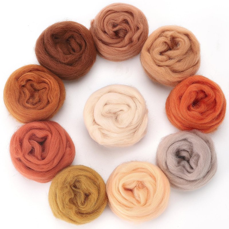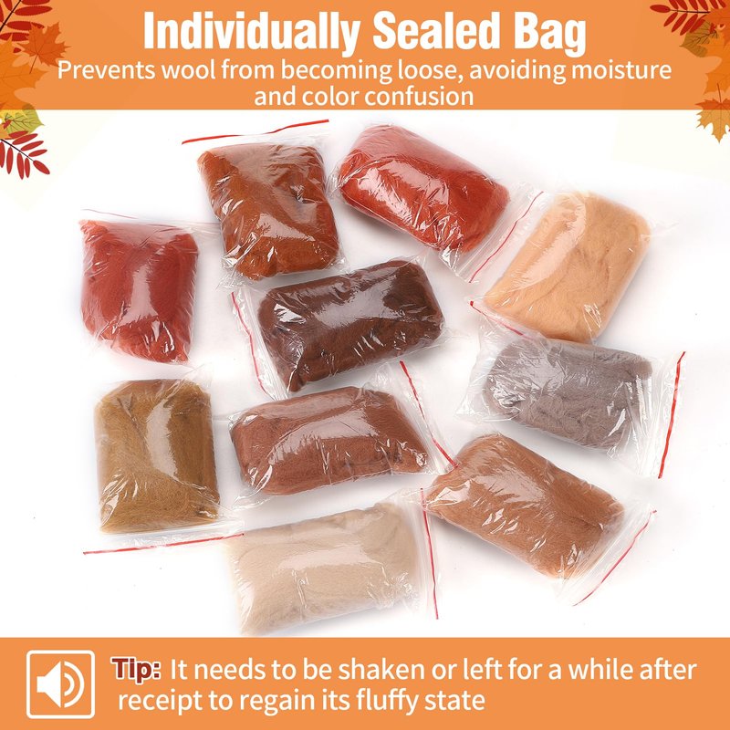 - 【Fall-style Wool】We offer you 10 packs of wool roving with a strong fall atmosphere in 10 beautiful earth tones such as orange and brown, perfect for fall, Thanksgiving, and Halloween-themed crafts. With the rich colors and enough quantity, you can DIY many lovely felt crafts without any worries.