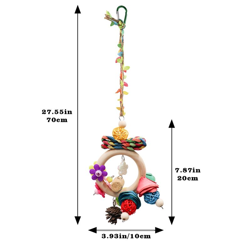- Colorful and Decorative: The combination of the natural wood color and various colorful chewing materials creates a visually appealing and harmonious toy. Not only does it serve as an engaging chewing toy, but it also acts as a beautiful decoration for your birdcage, enhancing its overall aesthetic.