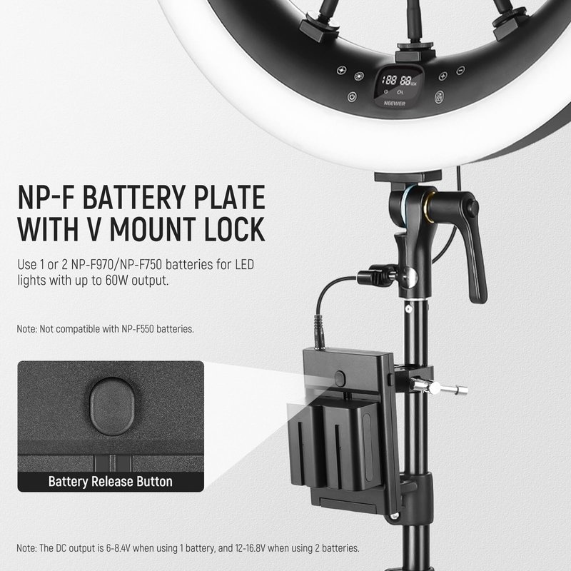 - 【Dual Channel NP-F to V Mount Battery Converter Adapter Plate】 The NP-F battery plate with two channels can hold either one NP-F970 or NP-F750 battery for stand alone power supply or two of them to charge an LED video light, LED panel light, or ring light with a continuous lighting output of up to 60W. It features a battery lock for easy installation/removal and a side lock for V mount adapter detachment