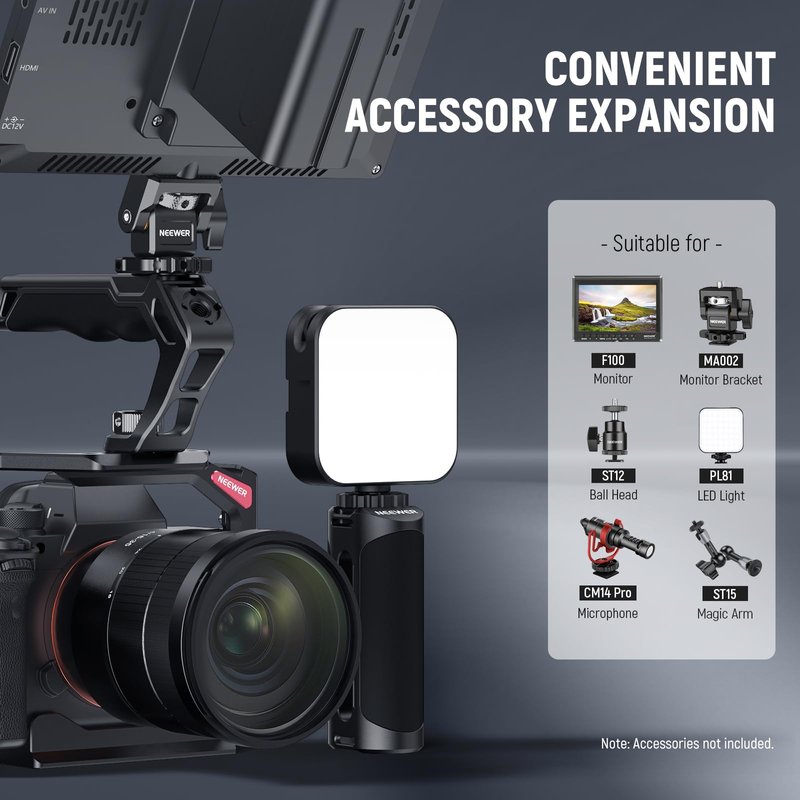 - 【Convenient Accessory Connection】 The Top Handle and the Side Handle Grip are designed with multiple 1/4" threads, 3/8" threads with ARRI locating holes, and cold shoes for mounting magic arms (UA012/ST15), monitor mounts (MA002/MA004), LED lights (PL81/RGB62), microphones (CM14 PRO), and other peripherals for enhanced video quality