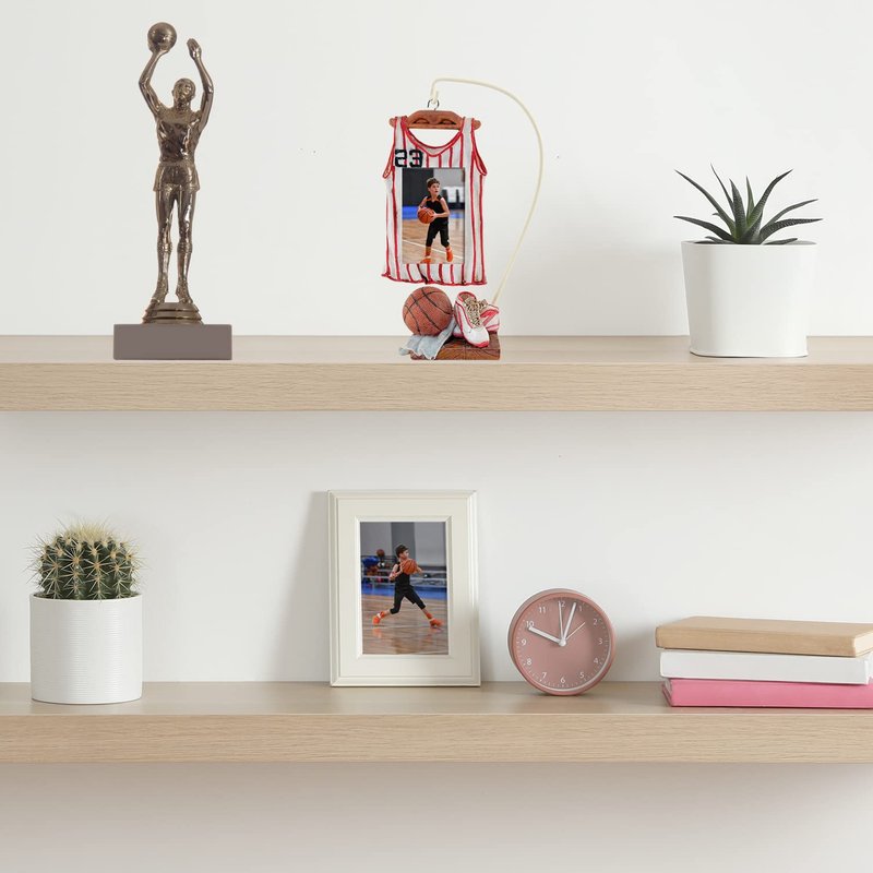 Now you can display all those exciting memories with Neil Enterprises Hanging Basketball Jersey Picture Frames. Frames are approximately 7.5” in height, and can hold one vertical photo in 2" x 3" size. Made out of resin, each frame is hand painted with intricate details, and includes a clear acetate to protect your photo. Designs on the frame feature a wood-like base that holds basketball shoes, a basketball, and a sweat towel. Coming out of the base is a white hook that stretches to the top of the frame where a basketball jersey is hanging from a brown hanger. Jersey details include a white jersey with red stripes, and the number 23 in black. To personalize, insert your photo through the back of the frame. Simple customization allows for you to change out your photos frequently, and with ease. These frames are perfect as gifts for the team to display their favorite basketball pictures, or as gifts for coaches, staff, fans, or any basketball themed event. Also makes a great add-on to sport photography packages.