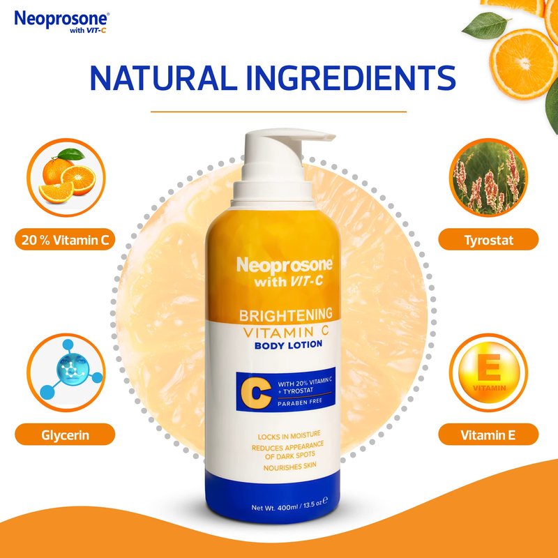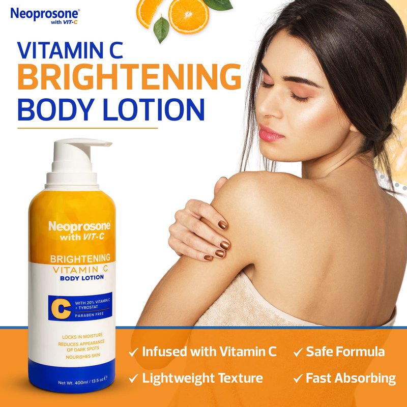 Neoprosone Brightening Body Lotion - 13.5 Fl Oz / 400ml - Formulated to Fade Dark Spots on Elbows, Knees, Neck, Body, and Intimate Parts, with Lactic Acid, Alpha Arbutin Complex, and Vitamin C