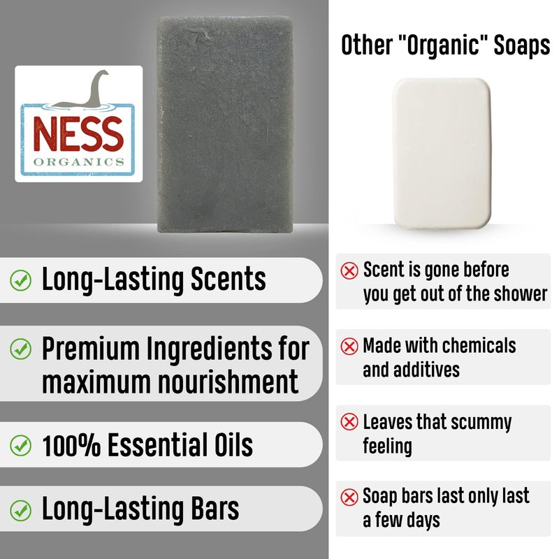 - ALL NATURAL BERGAMOT & MUSK SCENT - Ness Organics soap bars build a nice lather and create an authentic scent that will stick around for hours. Our organic soap bar has a long lasting scent made from essential oils and or fragrances that any man will love.