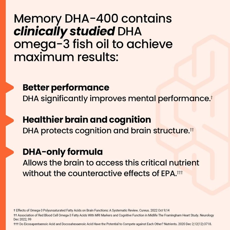 - Health Benefits - Boosts cognitive performance and supports overall brain function by improving blood flow and maintaining healthy cell membranes. Memory DHA-400 has been shown to improve recall, boost focus, enhance mental clarity, and increase neurological brain speed.
