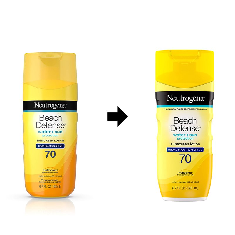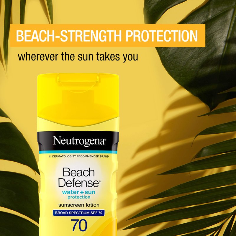 - 6.7-ounce bottle of Neutrogena Beach Defense Water Resistant Sunscreen Lotion for body with SPF 70 that helps prevent sunburn and decrease the risk of skin cancer when used as directed