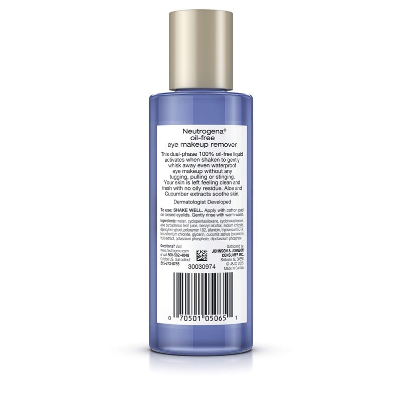 - Three 5 5-fluid ounce bottles of Neutrogena dual-phase 100% oil-free liquid eye makeup remover and makeup cleanser formulated with soothing aloe and cucumber for sensitive eyes