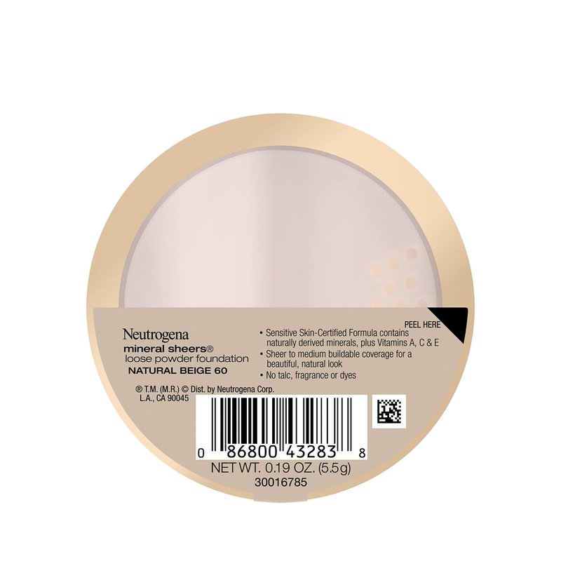 - Neutrogena Mineral Sheers Lightweight Loose Powder Makeup Foundation in Natural Beige 60 helps even and enhance skin clarity, tone and texture