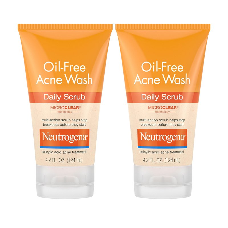 - Twin pack of two, 4.2-fluid ounce tubes of Neutrogena Oil-Free Acne Wash Daily Face Scrub with 2 percent salicylic acid acne medication to help clean and exfoliate deep into the pores to sweep away dirt, oil & pore-clogging dead skin cells