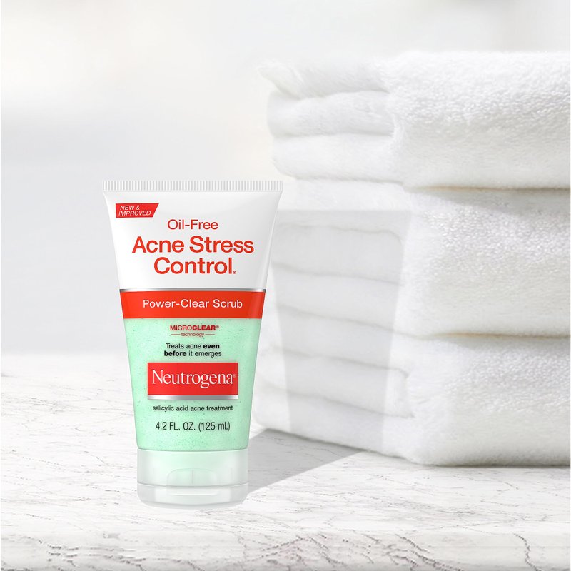 - 4.2-fluid ounce tube of Neutrogena Oil-Free Acne Stress Control Power-Clear Facial Scrub with 2% salicylic acid acne treatment medication gently cleanses and fights breakouts while gentle exfoliators sweep away dirt & oil