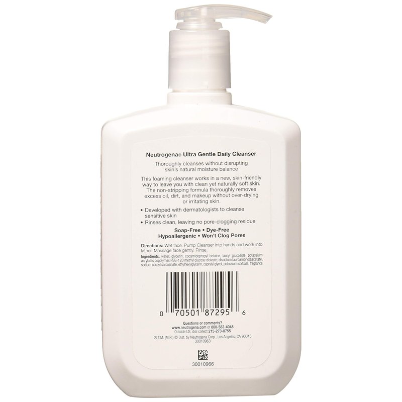 - 12-fluid ounce bottle of Neutrogena Ultra Gentle Daily Cleanser for sensitive skin that gently and effectively cleanses skin while protecting its natural moisture barrier