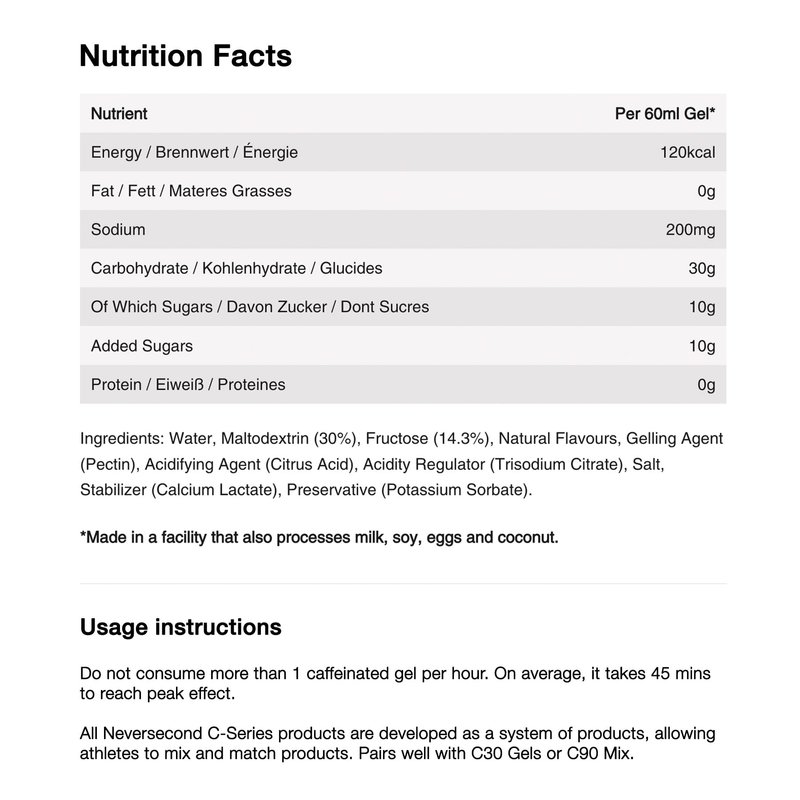 - OPTIMAL FUEL + FLUID: Neversecond products are athlete-focused and designed to accommodate an eating, hydration, and energy strategy that will fuel you adequately all the way to the finish line. Recommended consumption is 1 caffeinated gel every 60 minutes of intense exercise (maximum 4 caffeinated gels per day) depending on your anticipated completion time.
