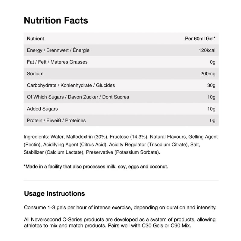 - OPTIMAL FUEL + FLUID: Neversecond products are athlete-focused and designed to accommodate an eating and hydration strategy that will fuel you adequately all the way to the finish line. Consume 1-3 gels every 60 minutes of intense exercise dependent on your needs to deliver optimal fuel and hydration.