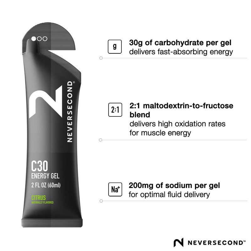 - CITRUS FLAVOR GELS: The next evolution of energy gels perfectly proportioned to deliver exactly what you need and nothing you don’t. Formulated with a thin consistency (not paste-like), our high-performance Never2 gels are easy to consume with or without water, providing 30g of fast-absorbing energy, and 200 mg of sodium to deliver and retain fluid with a mild citrus flavor to reduce the opportunity for gastric distress. Our C30 Energy Gel packs contain 12 single on-the-go servings.