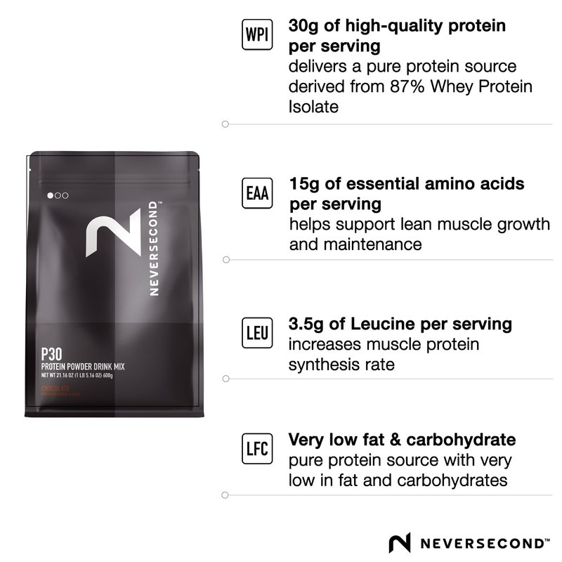 • CHOCOLATE FLAVOR DRINK MIX (15 SERVINGS): The Never2 P30 Recovery Drink Mix is a pure protein source that helps athletes recover from intense training and racing. It's formulated using 87% Whey Protein Isolate, with each serving delivering 30g of high-quality protein, 15g of essential amino acids to help support lean muscle growth and maintenance, and 3.5g of Leucine to increase the muscle protein synthesis rate. Ideal for endurance trail running, marathons, ultramarathons, and Ironman races.