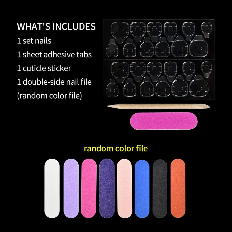- Package: 1 set nails, 1 sheet double-sided sticker tabs, 1 mini file, 1 cuticle stick. Tips: if you want long-lasting and stronger, please use your pro. nail glue instead of the adhesive tabs. Nail glue stickers better for temporary task, be great options for home DIY manicure and urgent appointment.