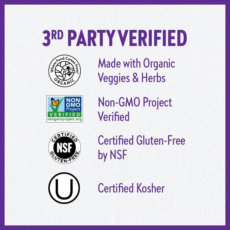 - Made with Certified Organic Vegetables & Herbs, Non-GMO Project Verified, 100% Vegetarian, Certified Gluten-Free by NSF, Certified Kosher, No Artificial flavors or colors, No Synthetic Fillers