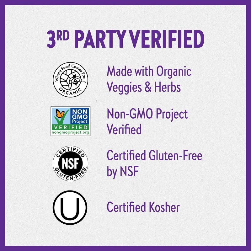 - Made with organic vegetables & herbs, Non-GMO Project Verified, 100% Vegetarian, Certified Gluten-Free by NSF, Certified Kosher, No Artificial flavors or colors, No Synthetic Fillers