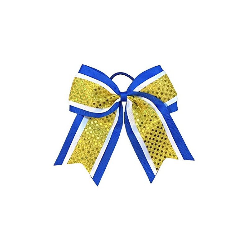 This listing is for a Boutique Grosgrain Ribbon Cheerleading Hairbow! FUNKY & FUN! These are hand-made by me! The Hairbow is made out of royal blue colored premium 3 inch grosgrain ribbon, white grosgrain ribbon, and a sparkly yellow gold confetti dot tulle fabric! These Boutique Bows are approx. 7 inches in length and 7 inches wide. Cheer Bows are attached to a stretchy elastic hair tie! Great for Cheer Practice, Football Games, Pageants, Cheerleading, Gymnastics, Dance, Vacations, Birthdays, 4th of July, Patriotic Events, Easter, and more! Your daughter will love these bows! Check out my store for other hairbow colors & styles!