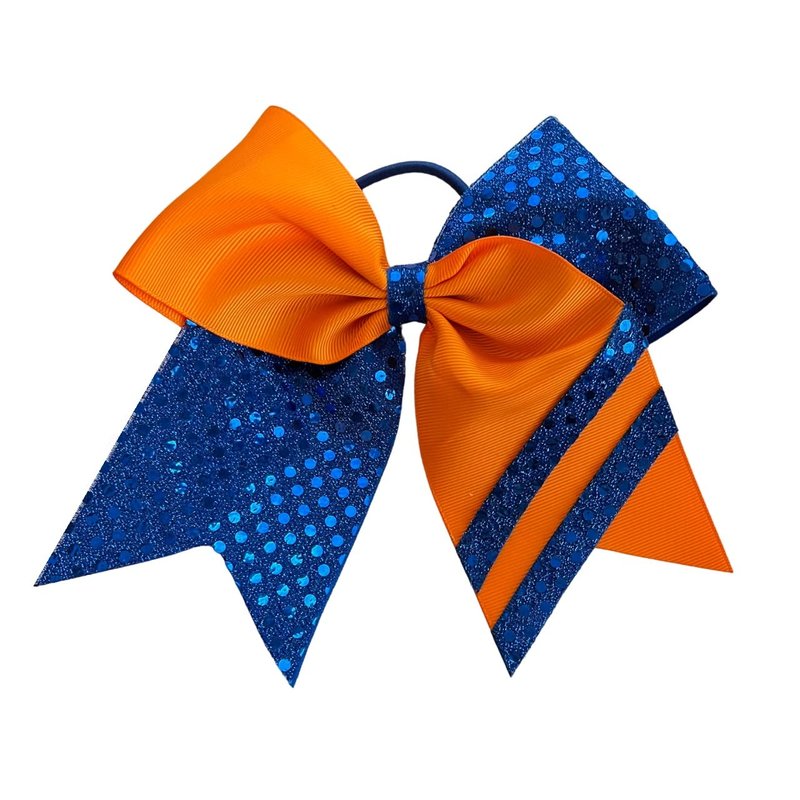 This listing is for a Boutique Grosgrain Ribbon Cheerleading Hairbow! FUNKY & FUN! These are hand-made by me! The Hairbow is made out of orange colored premium 3 inch grosgrain ribbon and a sparkly royal blue confetti dot tulle fabric! These Boutique Bows are approx. 7 inches in length and 7 inches wide. Cheer Bows are attached to a stretchy elastic hair tie! Great for Cheer Practice, Football Games, Pageants, Cheerleading, Gymnastics, Dance, Vacations, Birthdays, Competitions and more! Your daughter will love these bows! Check out my store for other hairbow colors & styles!