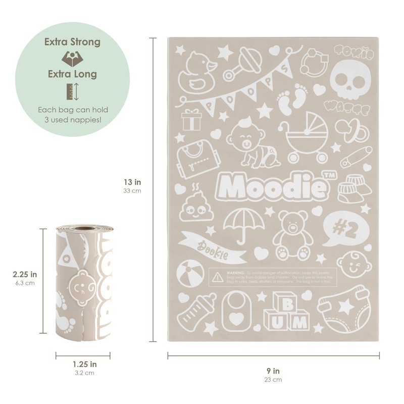 - CONVENIENT & EASY TO USE: Each diaper disposal bag dispenser has been custom engineered with a twist cap for quick and easy refill bag roll insertion and removal. Our poop bag edges are serrated for easy tearing without damaging the next diaper bag on the roll. The adorable Moodie teddy bear diaper bag dispenser is also designed with a cylinder roll holder inside the dispenser top that keeps rolls in place for easy tearing.