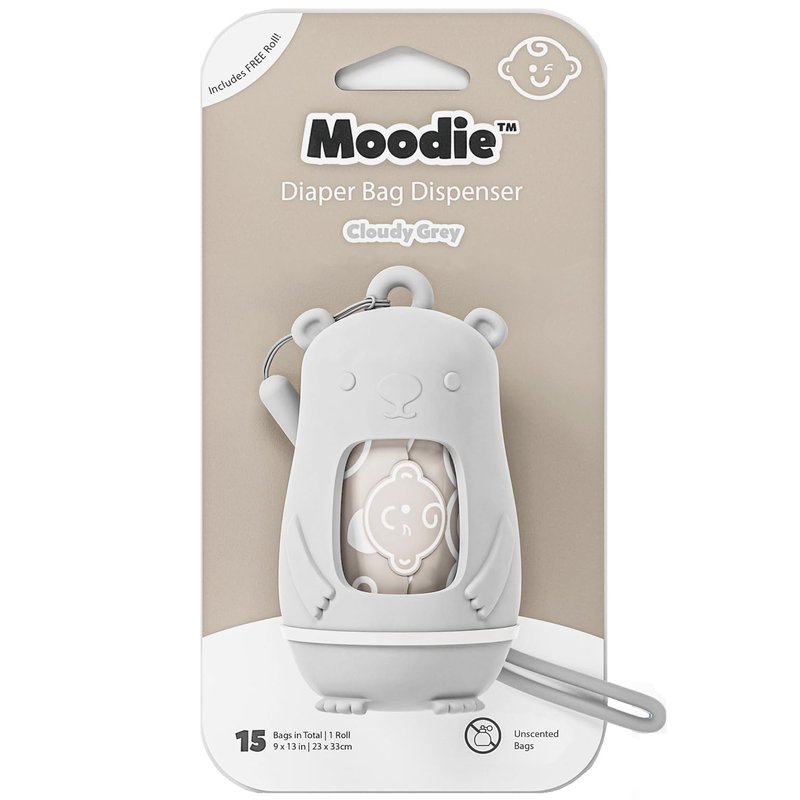 NEW Moodie Teddy Bear Diaper Bag Dispenser | Diaper Bag on the Go Dispenser w/Silicon Strap |15 UNSCENTED Diaper Disposal Bags per Roll | Diaper bag essential items (CLOUDY GREY)