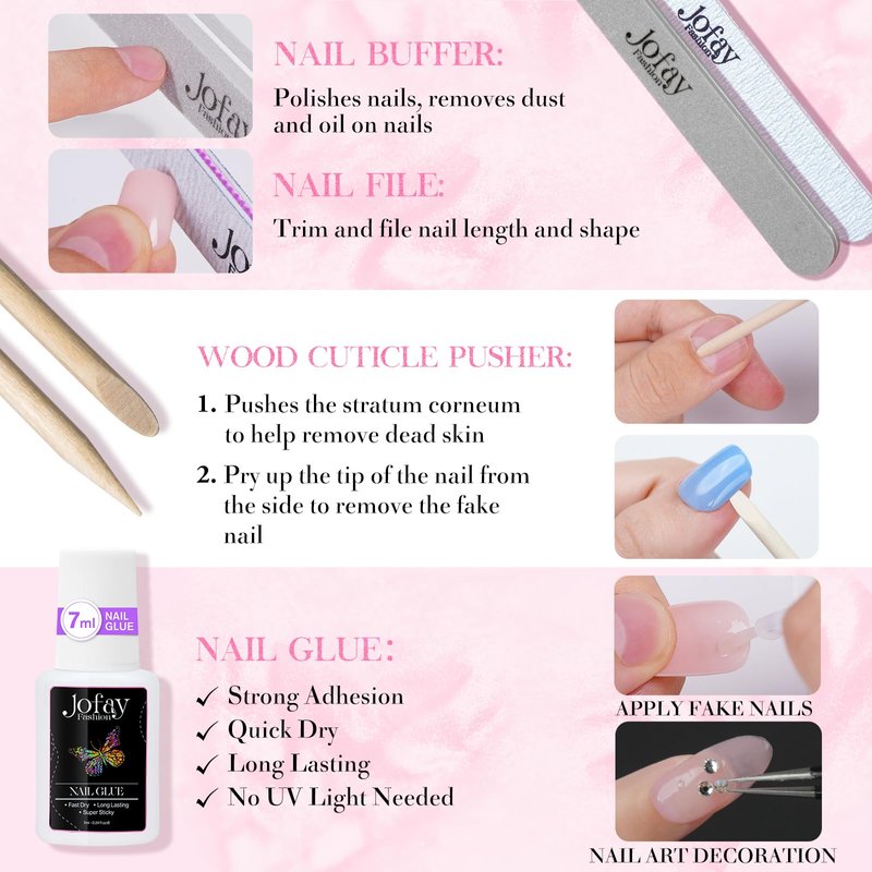 - 【✨ Press On and Go】The false nail set with glue can be a perfect replacement for salon manicures. Jofay Fashion Nail Glue is strong, quick-drying, and long-lasting, making it perfect for attaching artificial nail tips, rhinestones, glitter, and more. Strong adhesive nail glue does not need uv lamp to cure, just press until dry. The fake nails kit is lightweight and easy to carry around, whether you are traveling or on a business trip, you can quickly change your nails anytime, anywhere.