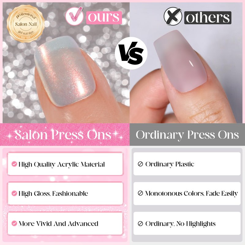 - 【✨ New Upgraded Salon Effects】This press-on nail kit includes 5 different colors of glazed chrome press-on nails, mermaid/pearl/aurora chrome nails, a total of 120 chrome nail tips. 1* nail file, 1* nail buffer, 1* nail glue 7ml, 10* pre pads, 2* cuticle pusher, 3* nail art stickers and instruction booklet. Say goodbye to the nail salon, and get more salon-effect nails at home in just 10 minutes.