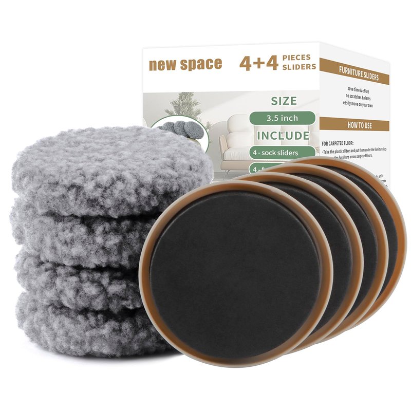 new space 3.5" Furniture Sliders, Multi-Surface Reusable Moving Pads for Furniture, 4 Pack Furniture Movers for Carpet + 4 Hardwood Socks - Protect Floor and Move Your Furniture on Any Surface Easily!